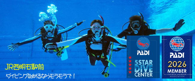 ダイビングショップ・モラモラは、世界最大のダイビング指導団体PADIから正式に認可を受けた5スター・ダイブセンターです。ダイビングスクールとして、これからダイビングを始める方向けのCカード取得コースからプロコースまで各種PADIコースを開催。ダイビングツアーも毎週開催しております!ダイビング器材の販売・メンテナンスもお任せ下さい。JR西明石駅から徒歩3分、神戸市・加古川市・姫路市からもアクセス抜群!ダイビング&海に関する事なら、何でもお気軽にご相談ください。