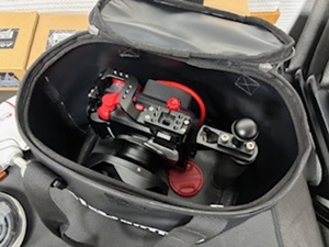 カメラ機材がスッポリと入るサイズの簡易防水バッグ、写真はワイドレンズ&アームを付けた状態のTG7。